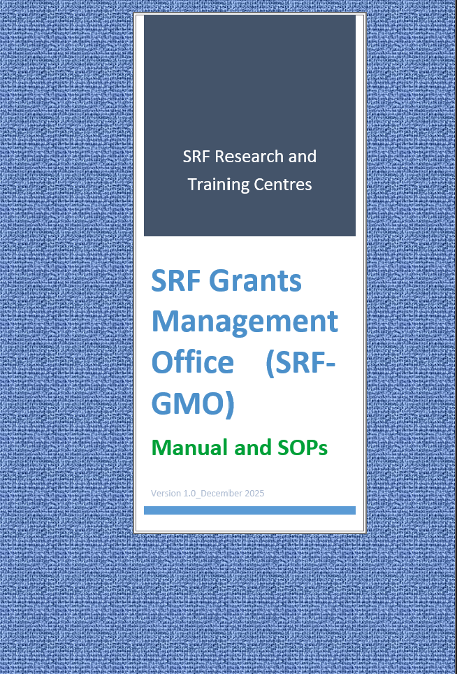 The SRF and Training Centres (SRF-RTCs) has Grants Management Guidelines and Standard Operating Procedures (SOPs) that provide a formal framework for the solicitation, awarding, management, monitoring, reporting, and closeout of research grants handled at SRF Research and Training Centres. SRF-RTCs hold primary responsibility for grant administration, financial stewardship, compliance, and reporting to external donors, while maintaining alignment with SRF institutional standards and guidelines. These guidelines ensure: Efficient utilization of grant resources; Compliance with donor, institutional, national, and international regulations; Accountability, transparency, and equitable financial practices; Strengthening of research governance and capacity within RTCs. SRF-RTCs is registered on SAM.gov and so can receive US grants like NIH (Unique Entity ID: KF4CERE5M9W1) with the following full address: SRF Research and Training Centres LTD