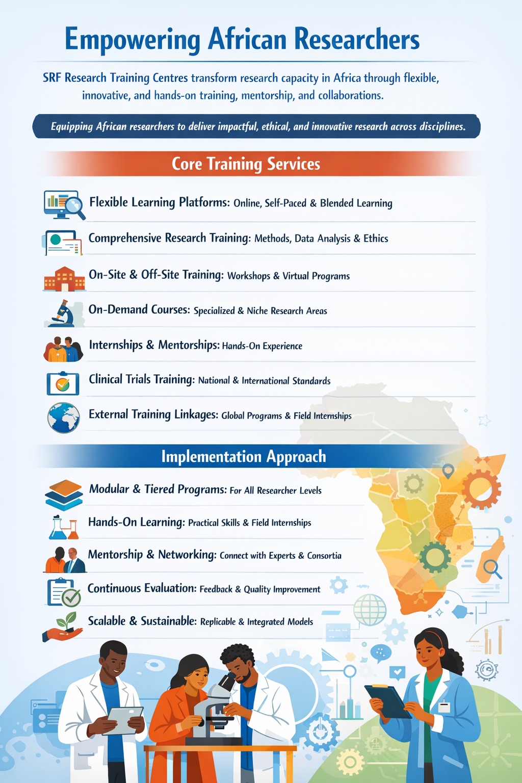 We aim at strengthening African research capacity through tailored, high-quality, and innovative training programs, fostering research excellence, ethical practice, and innovation. We envision a continent of highly skilled, innovative, and ethically grounded African researchers. We achieve this through equipping researchers and innovators with cutting-edge research skills, practical experience, mentorship and linkage to strategic networks to allow advancement in research careers.
