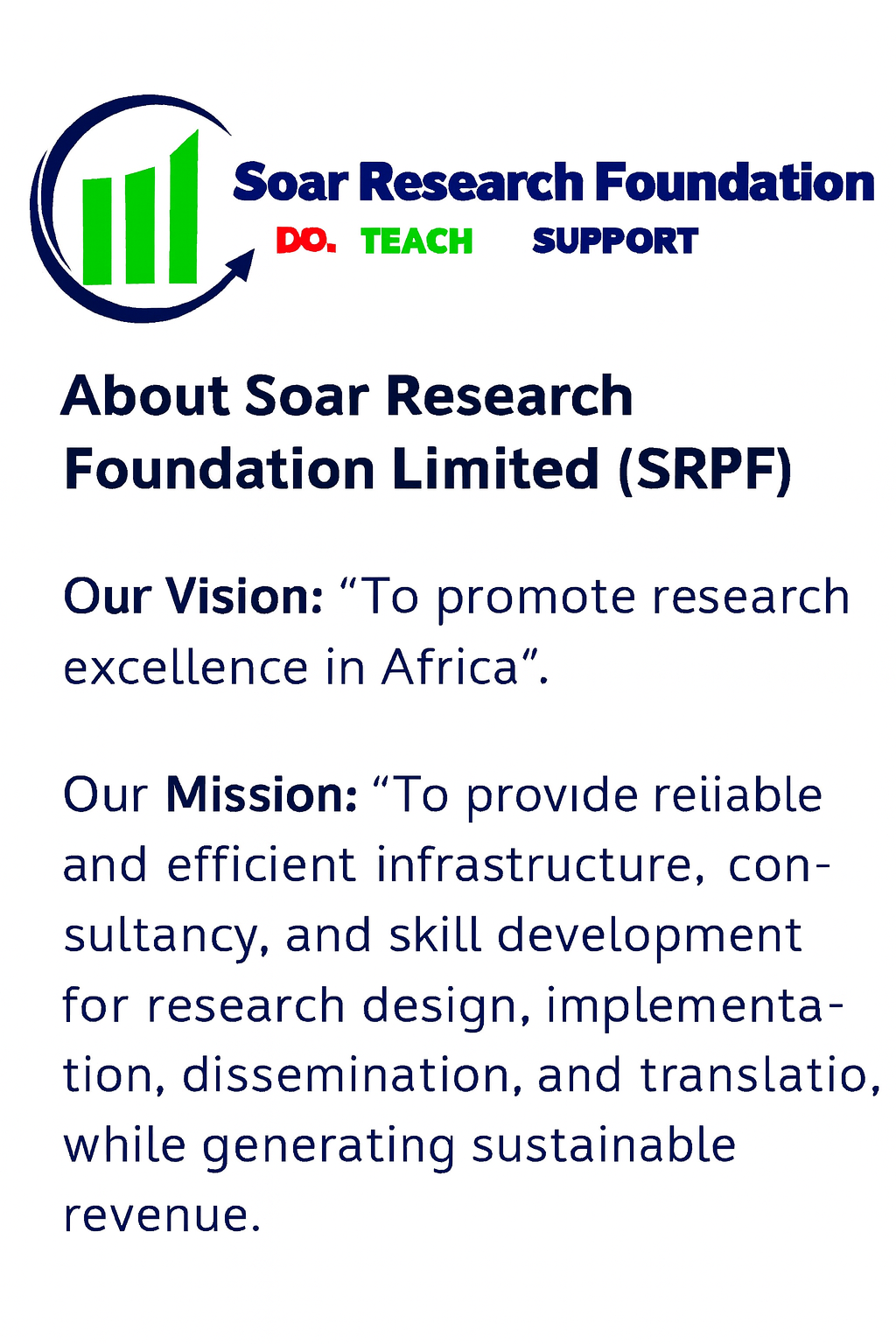 SRF Research and Training Centres LTD (SRF-RTCs) is a not-for-profit research organization (Reg. No. 80034853666921) committed to advancing Africa’s development through research excellence, innovation, and capacity strengthening. Established in 2010 as a grassroots consultancy, SRF has grown into a mission-driven research organization in Uganda, complemented by the Soar Research Foundation (SRF) Limited, a sustainability platform providing research consultancy, training, project evaluation and dissemination services. Through its flagship Support Initiative for African Researchers (SIFAR), SRF-RTCs mentors and trains students and graduates, nurturing a new generation of research-empowered Africans driving sustainable development across the continent.