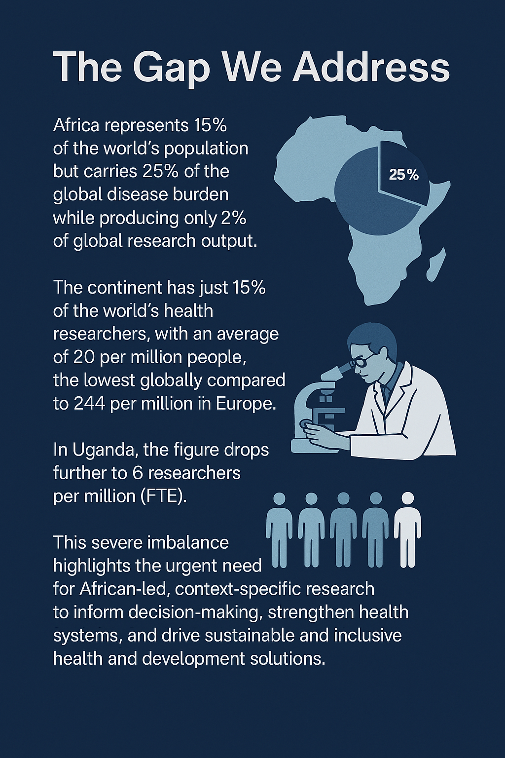Africa represents 15% of the world’s population but carries 25% of the global disease burden while producing only 2% of global research output. The continent has just 15% of the world’s health researchers, with an average of 20 per million people, the lowest globally compared to 244 per million in Europe. In Uganda, the figure drops further to 6 researchers per million (FTE). This severe imbalance highlights the urgent need for African-led, context-specific research to inform decision-making, strengthen health systems, and drive sustainable and inclusive health and development solutions.