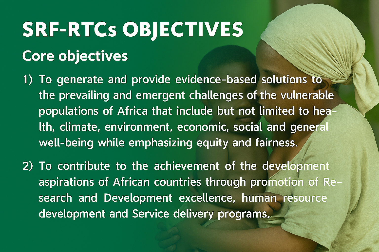 1) To generate and provide evidence-based solutions to the prevailing and emergent challenges of the vulnerable populations of Africa that include but not limited to health, climate, environment, economic, social and general well-being while emphasizing equity and fairness. 2) To contribute to the achievement of the development aspirations of African countries through promotion of Research and Development excellence, human resource development and Service delivery programs.
